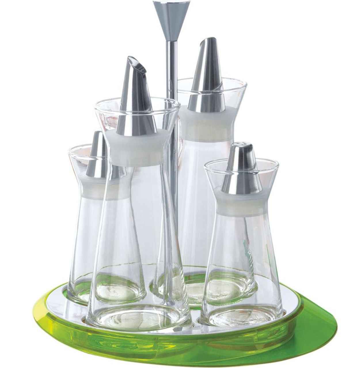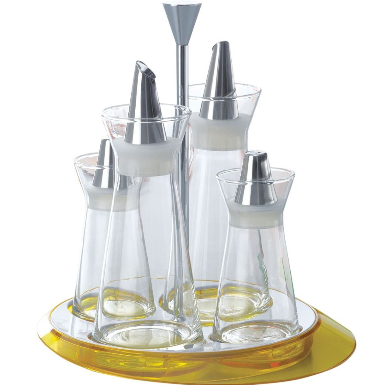 L'ensemble d'étagères à épices jaune Glamour Series se compose de quatre pièces : une bouteille d'huile, une bouteille de vinaigre et une salière et poivrière.