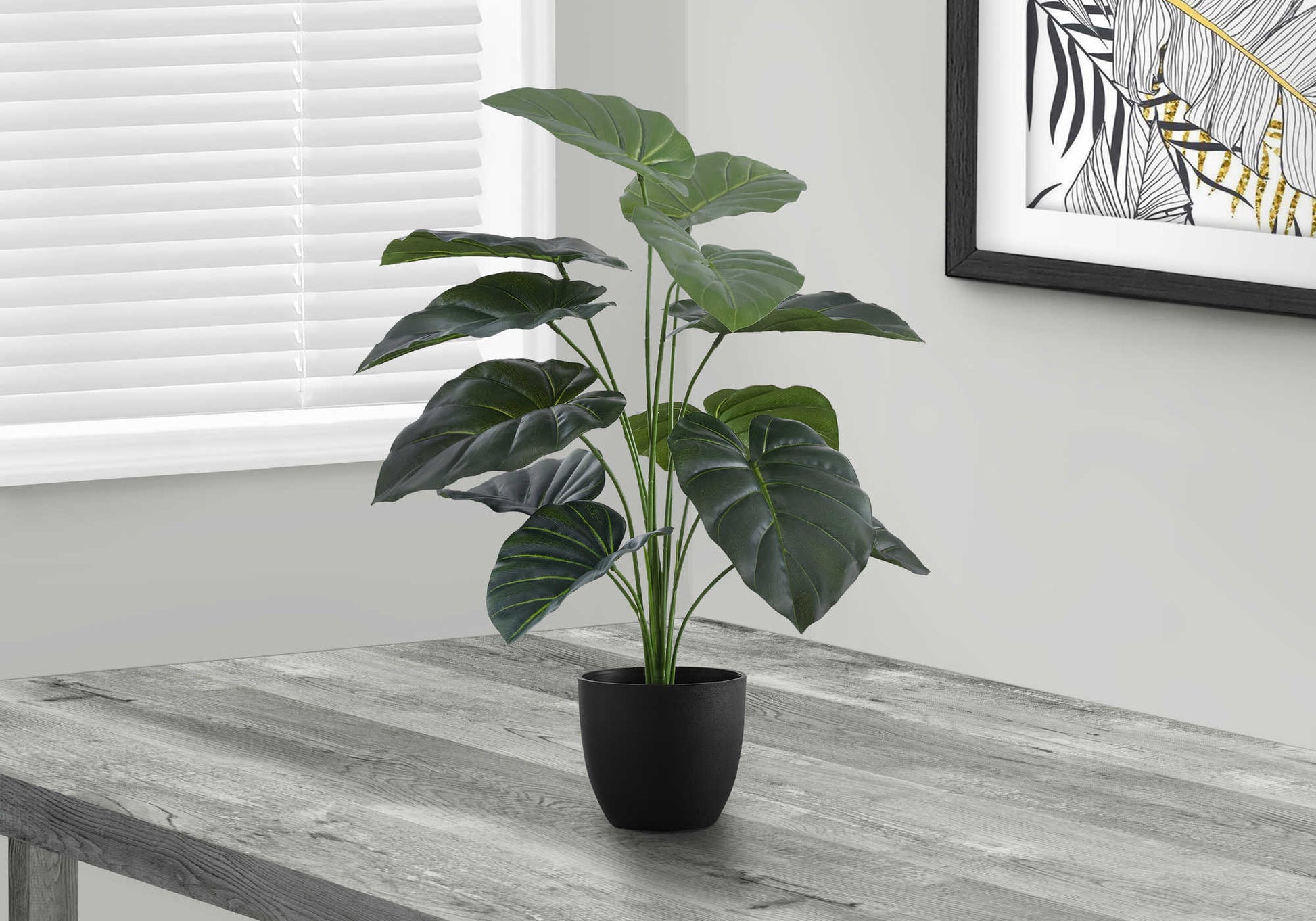 - Ajoutez une touche de verdure à votre espace avec cette Alocasia artificielle de 24", installée dans un pot noir de 5".